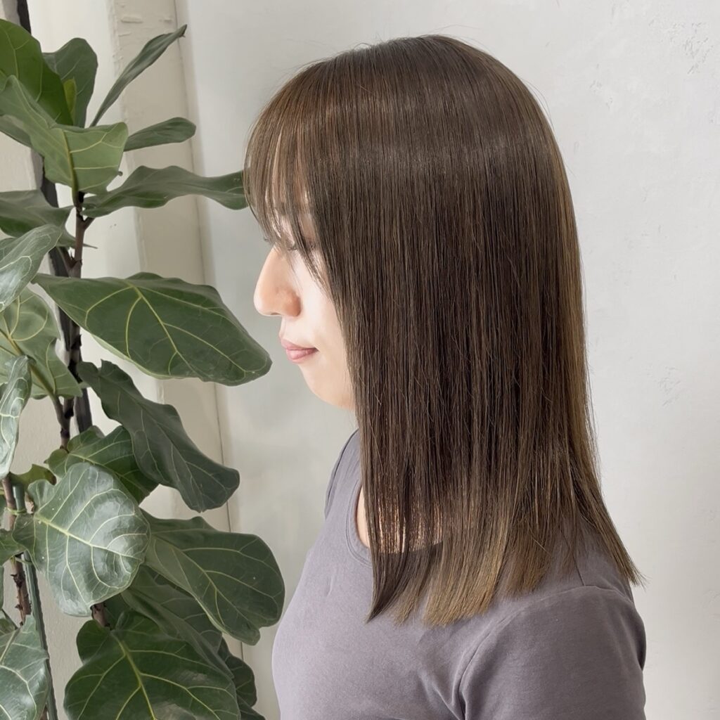 自然なツヤ感と品のある柔らかさが魅力の「オリーブベージュカラー」と毛先にかけて軽やかさを演出するナチュラルストレートスタイル