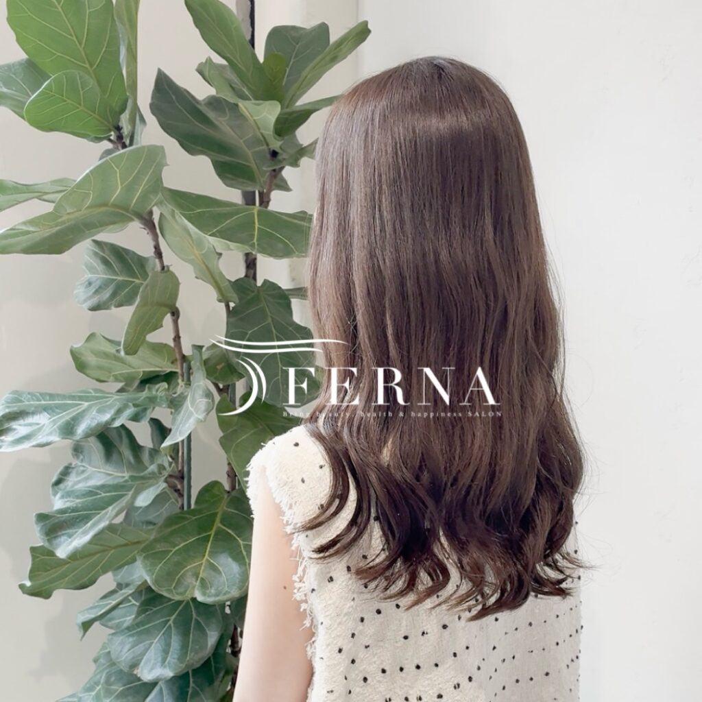 柔らかなグレージュカラーが光を透かして、透明感のあるツヤ髪に仕上がっています。