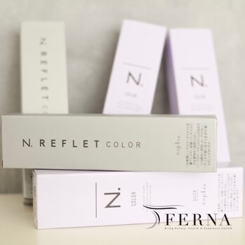 (FERNAでは、頭皮・髪にやさしいオーガニック成分配合、ナチュラルハーブエキス配合のカラー剤を使用します)