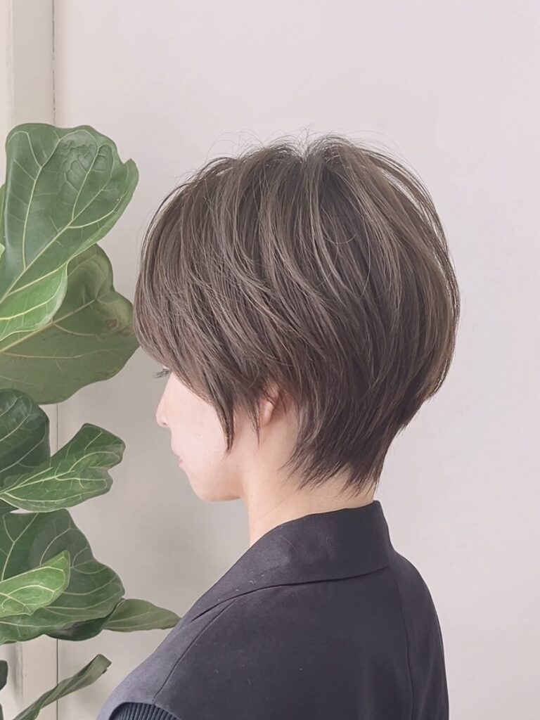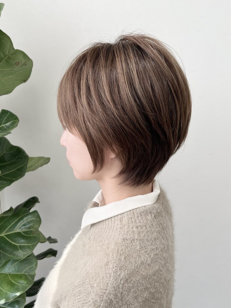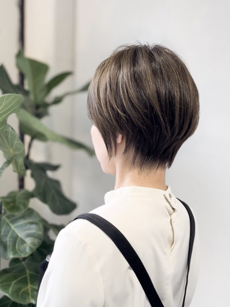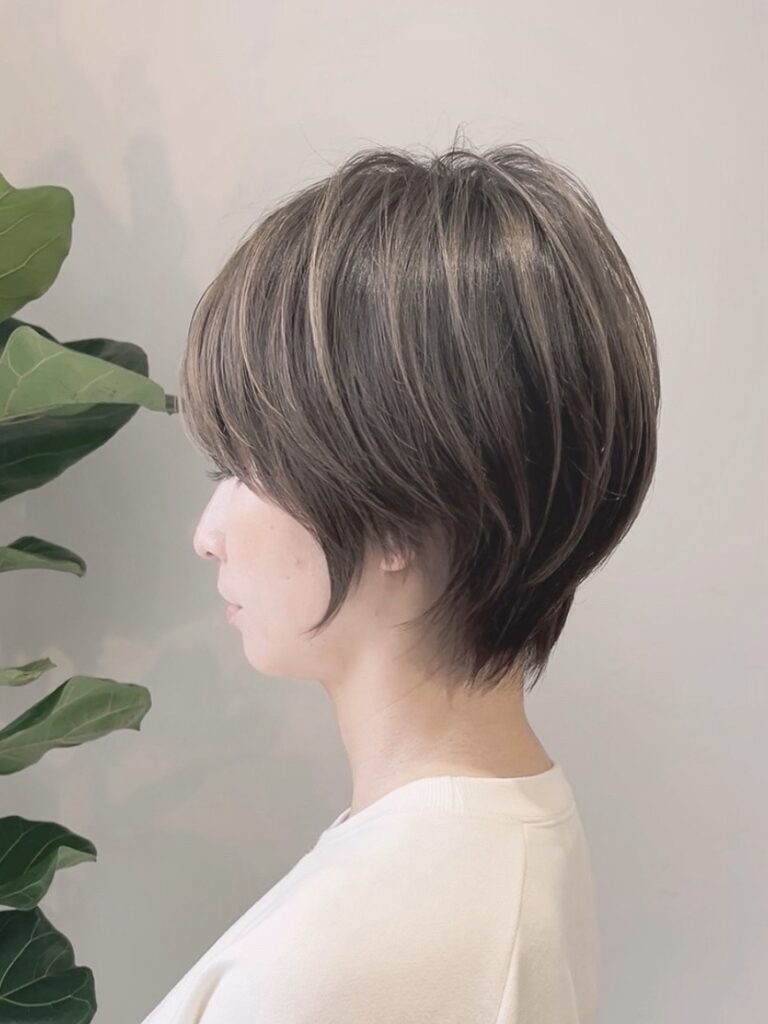 後頭部の綺麗な丸みは残しつつ、襟足は首に沿うタイトなメリハリのある大人ショート。存在感のあるハイライトでカッコ良さも演出。